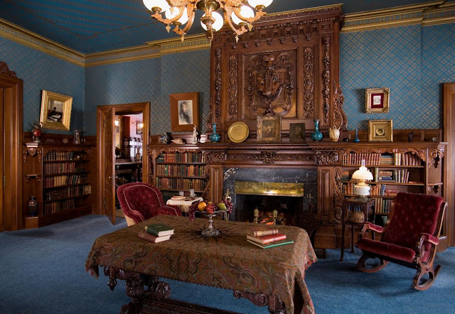 library, perhaps the most appealing room in the mansion, boasts a large, carved