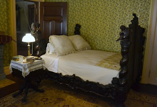 huge, ornately carved walnut bed on which rest four angels on each corner post,